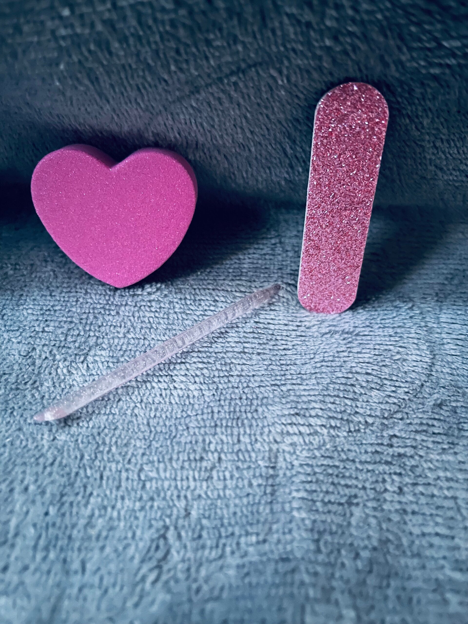 - Heart-shaped nail buffer: This item, often made of a sponge material with different grit levels on each side, is used for smoothing and polishing the nail surface to achieve a glossy finish before or instead of applying polish.