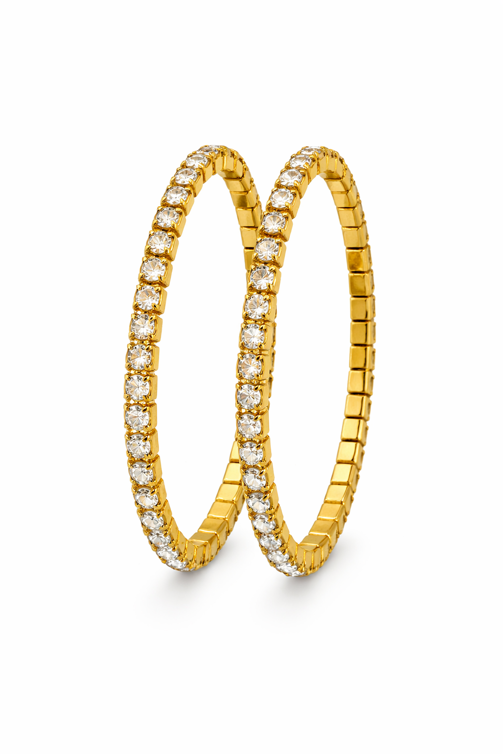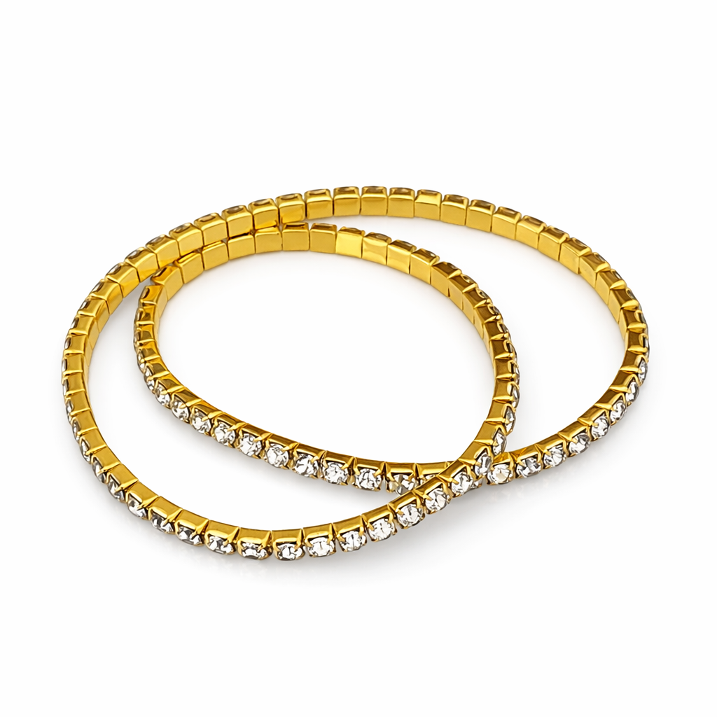 •Two shimmering tennis‑style bracelets that wrap the wrist in a continuous line of glittering stones,a timeless jewelry style known for their flexible, uniform row of stones that drape gracefully around the wrist, blending everyday wear with special‑occasion polish.