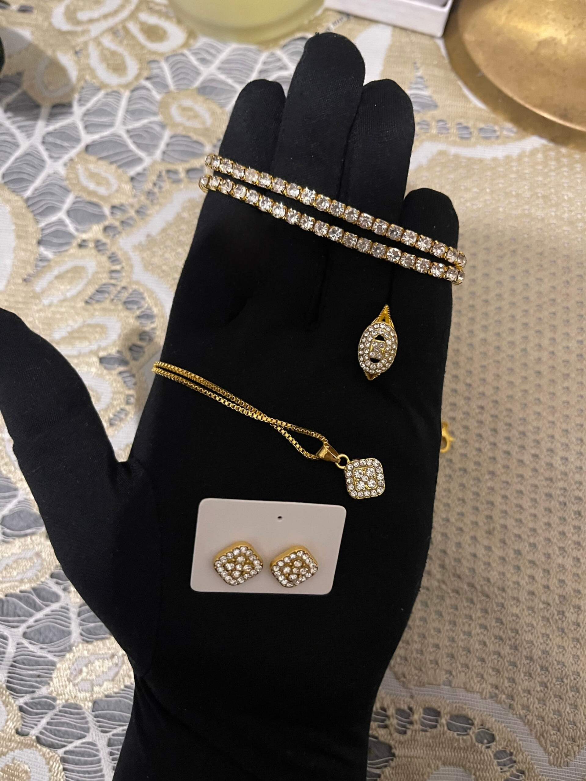 •A matching pair of square stud earrings, tiny but attention‑grabbing, rounding out the set so you have everything needed for a coordinated, red‑carpet look.